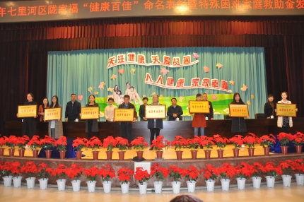 为全面贯彻落实全国、全省及全市卫生与健康大会精神,按照省、市卫生计生委、计生协《关于开展陇家福“健康百佳”评选活动的通知》要求,11月2日,七里河区在区政府四楼会议室举办了以“关注健康、关爱贫困,人人健康、家家幸福”为主题的陇家福“健康百佳”命名表彰暨特殊困难家庭救助金发放仪式。